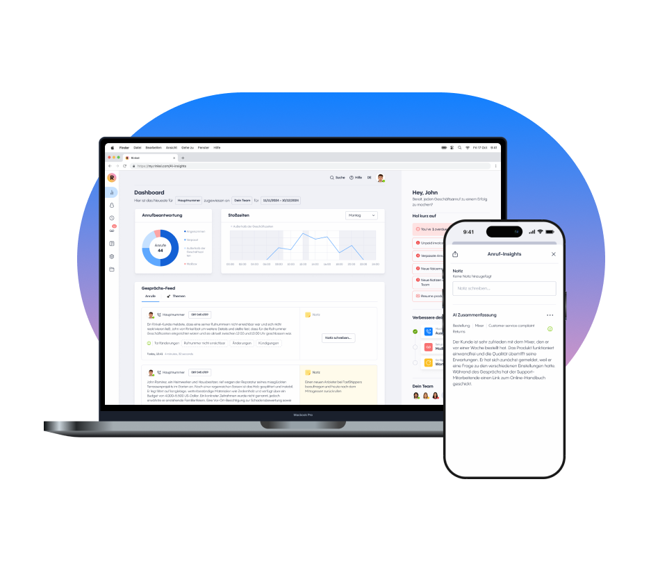 Das Dashboard erspart deinem Team das händische Mitschreiben oder das Weitergeben von Gesprächskontexten. Sie konzentrieren sich ganz auf die Nachbereitung – und du holst dir alle Infos in kompakten Zusammenfassungen und Stimmungsübersichten zurück.