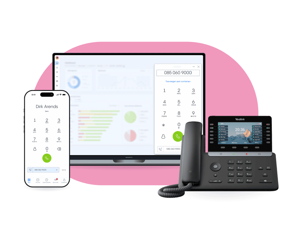 Uitbellen met je vaste nummer kan eenvoudig via de Rinkel app, de Webphone op je laptop of vanaf een vast toestel. Zo ziet de ontvanger altijd je professionele zakelijke nummer, ongeacht waar je bent. Makkelijk, herkenbaar en professioneel — precies zoals jij het wilt.